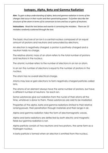 Differentiate between alpha, beta and gamma radiation in terms of: Symbol . Composition . Charge . Mass . Common source . Penetrating power . Shielding. Video Quiz from Discovery Education: Atomic Structure Review Discuss answers to the video quiz. ... Access Document